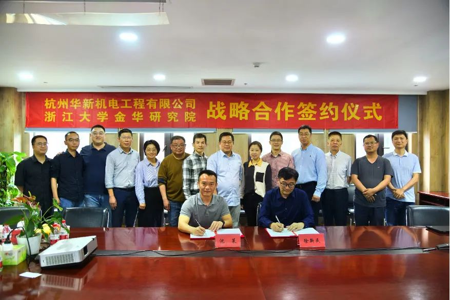 在嘉賓們的共同見證下,公司副總經理沈策與浙大金華院常務副院長徐新民共同簽署了《杭州華新機電工程有限公司-浙江大學金華研究院戰略合作協議》。