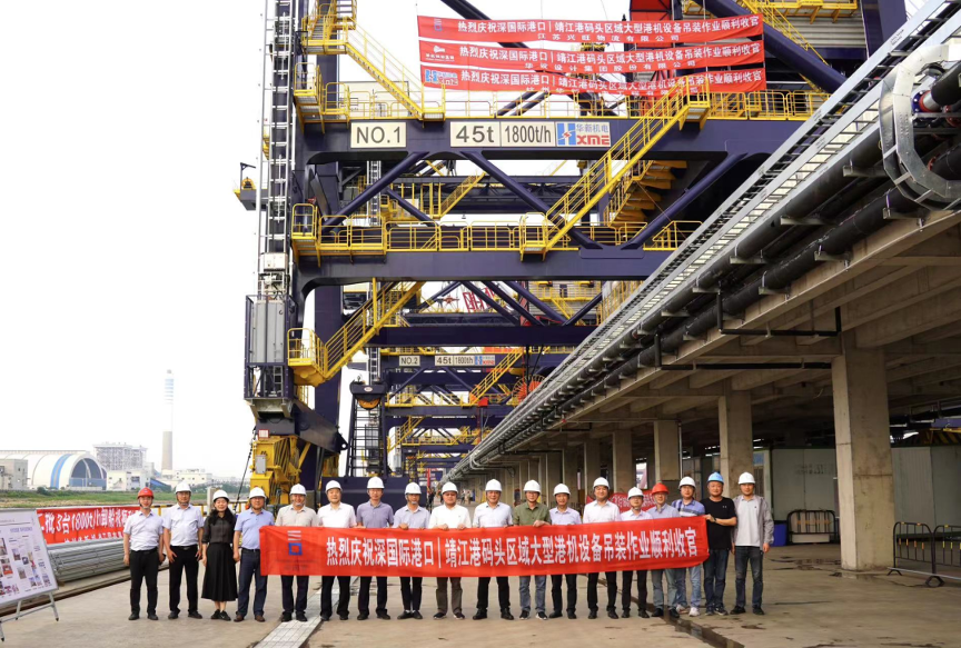 靖江項目主碼頭布置5臺卸船機(jī)和3臺裝船機(jī),卸船機(jī)高約59米,單機(jī)額定效率1800t/h,總重量約1350噸,是目前長江沿線卸煤生產(chǎn)效率最高、外形尺寸及整機(jī)重量最大、自動化程度最好的抓斗卸船機(jī)。裝船機(jī)額定效率為5400t/h(2臺)、3000t/h(1臺)。卸船機(jī)和裝船機(jī)對設(shè)備料斗部分采取了特殊措施,提高設(shè)備的環(huán)保性,并分別配置了高精度動態(tài)計量斗和高精度整列式皮帶秤,為打造智慧、綠色、高效、安全項目提供堅實的硬件基礎(chǔ)。