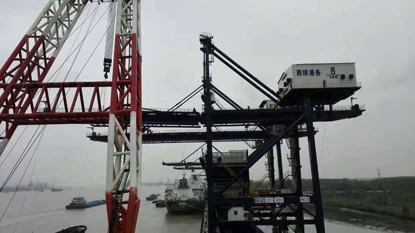 本次兩臺卸船機(7#機、8#機)于2016年9月中旬在張家港制造基地整機安裝結束后,于9月17日開始滾裝,并分別于9月19日,9月20日滾裝上船,加固海固件;9月21日具備發運條件并出港; 9月22日晚搭載卸船機的駁船“匯宗海”安全抵達西壩碼頭;9月24日和25日,卸船機正式吊裝上岸并順利入軌;吊裝小門架和安裝前大梁,標志著本次滾裝、運輸、吊裝工程全部順利完成。7#機、8#機是華新機電與南京西壩共同自主研發的第二套在線料斗稱重卸船機,歷時半年時間制造完成,技術國際領先,制造工藝先進,生產工期高效。